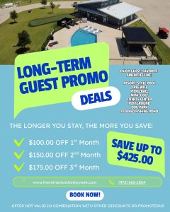 We are excited to announce the opening of our new Tiny Home Village at our sister property, Shady Creek RV Park. Nestled in the heart of North Texas, our community offers the perfect blend of tranquility and convenience. Click “Learn More” for more details.
